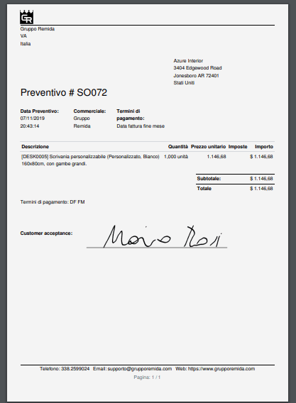 Questa configurazione permetterà di aggiungere un campo dedicato alla firma, ad esempio, di un preventivo/ordine di vendita.